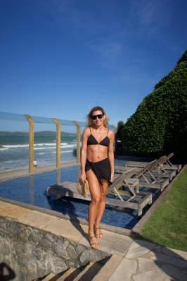 Proposta All Black (Como na foto): Para um visual de impacto e super elegante, combine com nossa Camisa Chemise Preta aberta e um biquíni preto por baixo. É o combo perfeito de proteção solar e estilo.